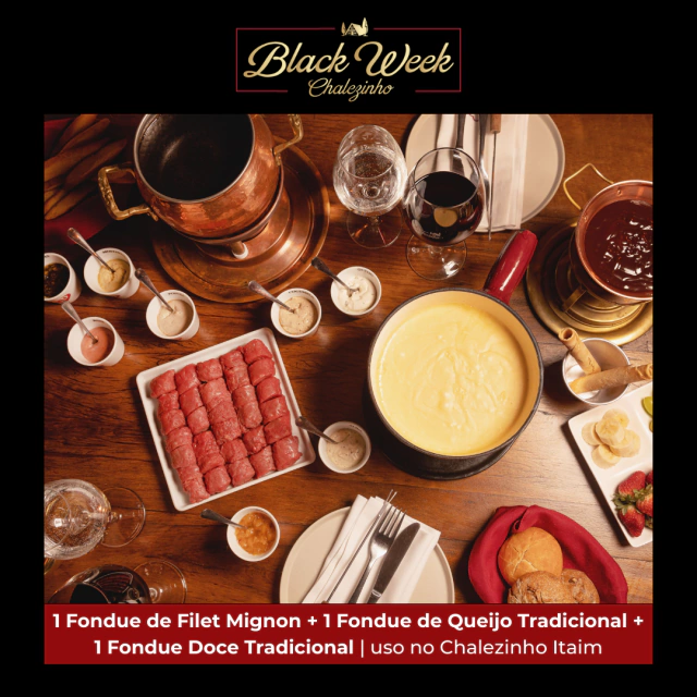 A sua compra garante 3 Fondues a la carte: 1 Fondue Queijo Tradicional + 1 Fondue de Carne Filet Mignon + 1 Fondue Doce Tradicional.